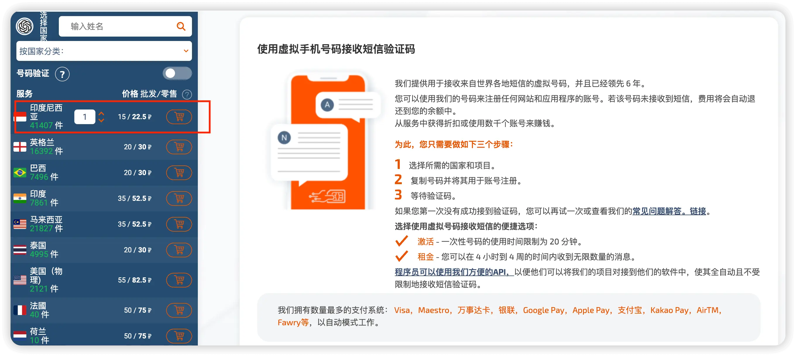 服务选择OpenAI,地区推荐马来西亚,我一开始选的是印度尼西亚(因为便宜),但是OpenAI监测到安全问题,拒绝发送验证码(未收到验证码,不收费),之后又选了马来西亚,成功注册。